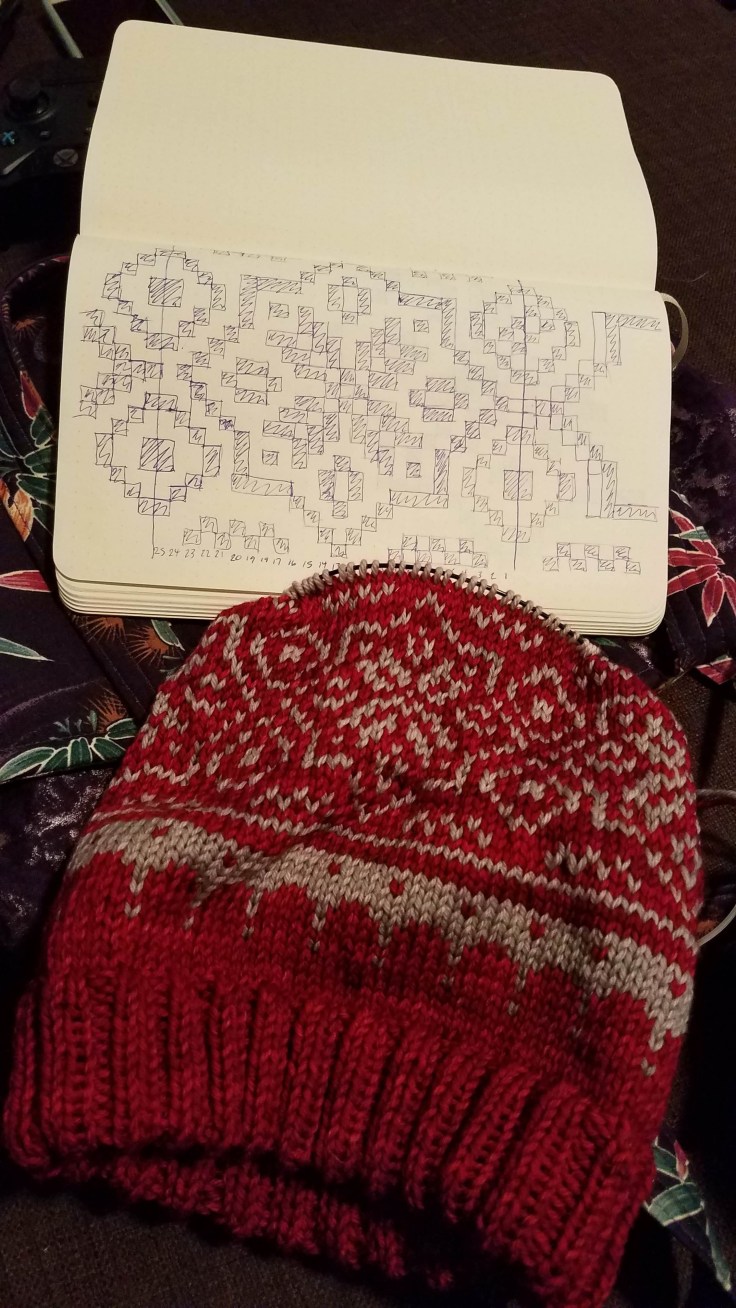 This hat was my first foray into stranded knitting. I used a sport weight Merino wool that I got from my local yarn shop. It’s a nice weight because you can make a fairly complex pattern fit into something the size of a hat. I planned the snowflake design out in with graph paper first which actually worked out really well for a dual-color design. While knitting the pattern, I held both colors in my left hand at the same time, the primary color wrapped around my index finger and the secondary around my middle finger. It was a bit challenging to properly tension the secondary color so some of the stitches in gray are looser than they should be.