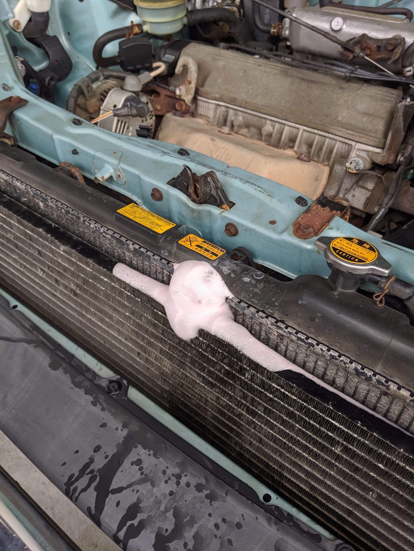 The engine temperature was still fine, so I continued another kilometer to the nearest car parts store and bought some radiator fluid and some K-Seal, a fluid that you put in with the coolant that is supposed to stop leaks. I couldn’t really tell how big the leak was with the foam on it, so I was hoping the K-Seal would be able to help.