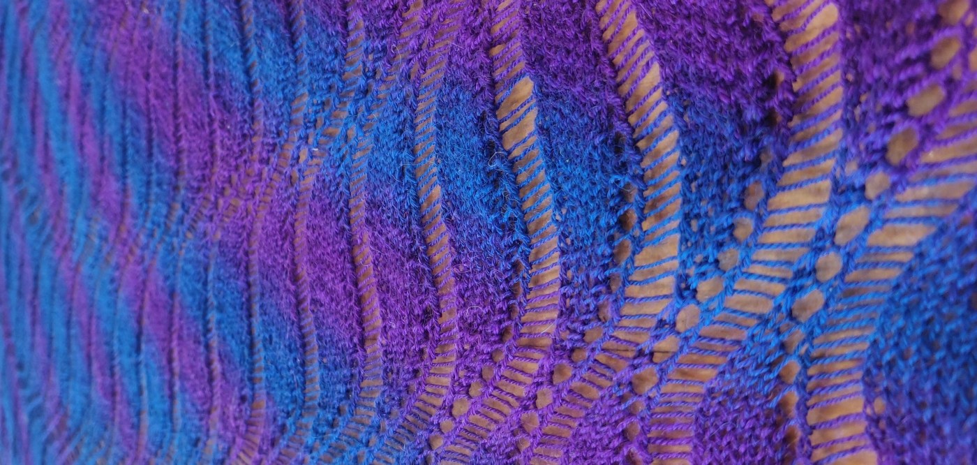 After I finished the yarn, I needed to figure what to do with it. I knew I wanted to make a scarf, but I wasn’t sure what the pattern should be. I’ve been spending lots of time near the ocean recently so I wanted to find something to imitate water. I played around trying to create a pattern with some scrap yarn but ultimately ended up buying a pattern that that I liked better: Aran Waves by Kieran Foley. I modified the pattern from a rectangular scarf into a boomerang scarf. I love the asymmetrical shape of boomerang scarves and they have the added benefit of being easy to adapt to whatever length of yarn is available. I also love what boomerang scarves do when you have two toned yarn. In the blocking picture, you can see how the sections of color get gradually smaller as you move across the scarf. To me it looks like a ripple dispersing.