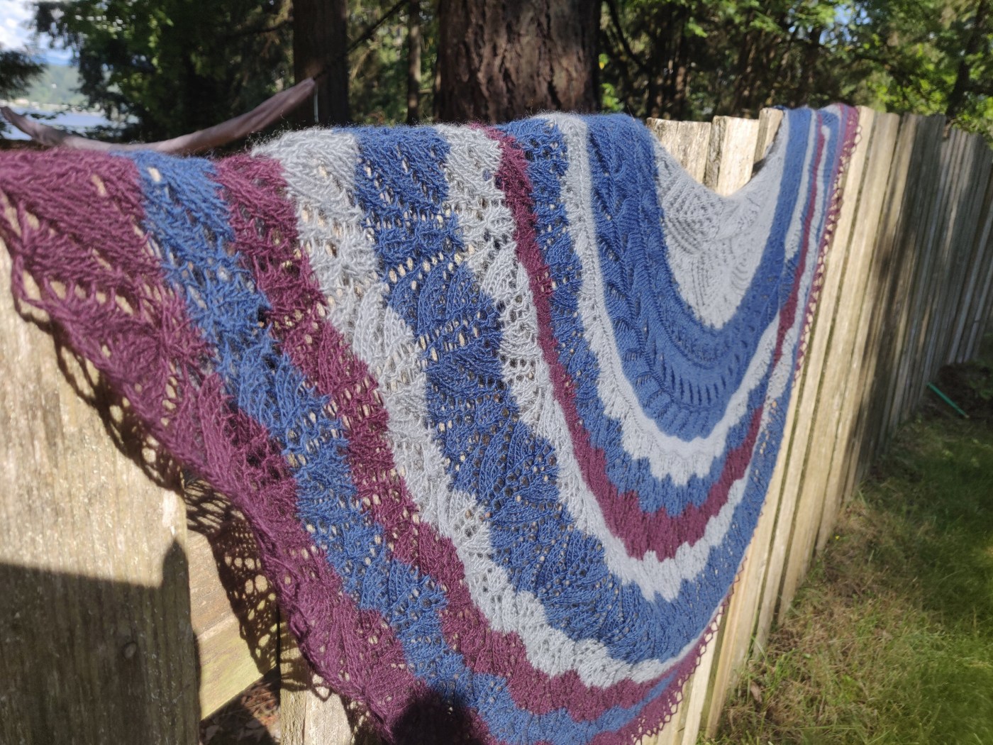I did end up playing a bit of yarn chicken with this one. I only had about a yard of the purple yarn left at the end… but everything worked out! The shawl turned out much larger than I expected (roughly 7.5ft tip to tip) which is actually great. I think I need to shoot for slightly larger shawls than I have in the past because this one is definitely one of the more comfortable projects I have made.