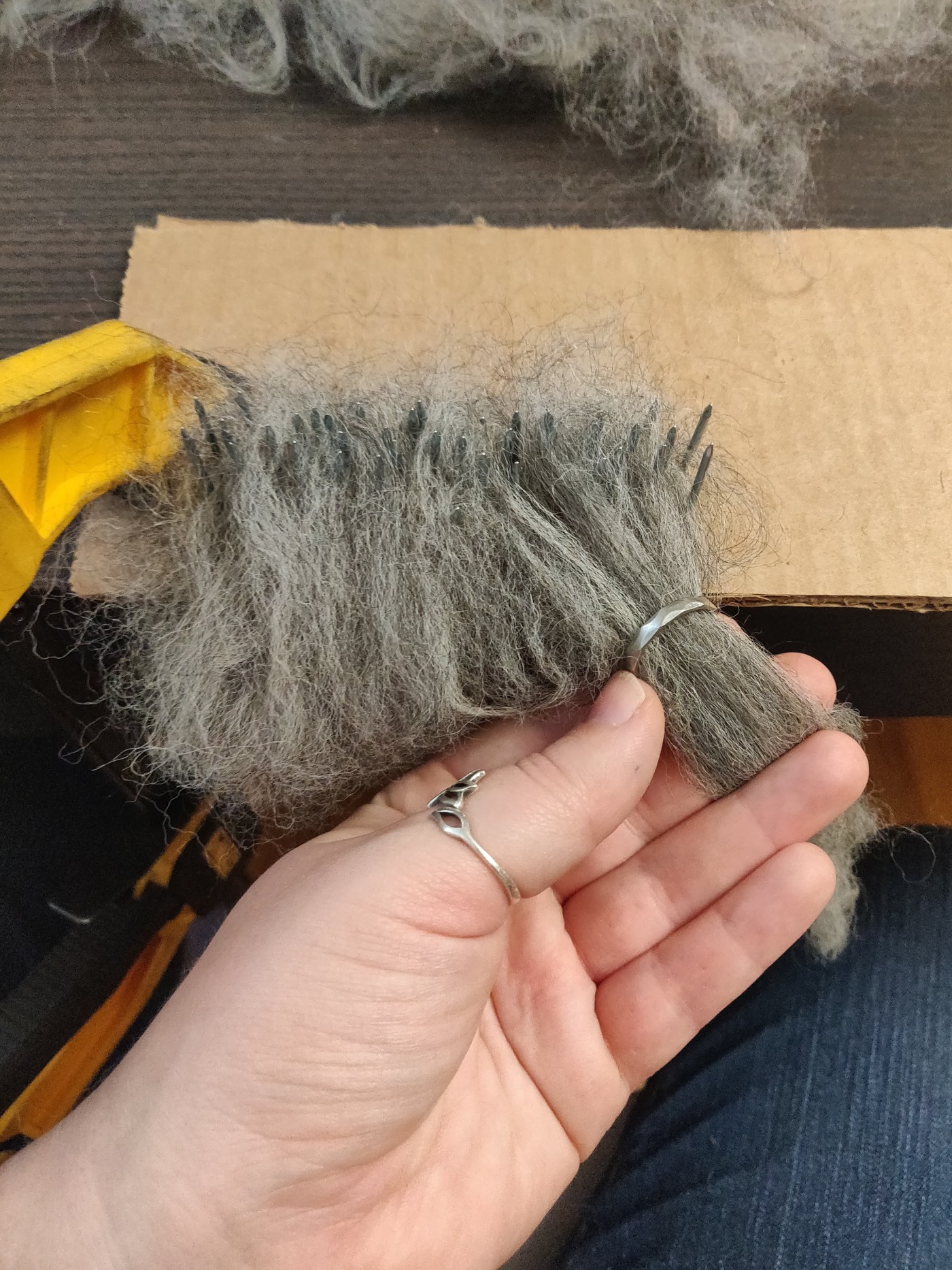 With my hackle assembled, I clamped the cardboard to my table, put some fiber on it and tested it out! I used a ring as my diz; probably could have done with a button or something else with a smaller hole, but it worked. I was able to “comb” about 50 grams of my fiber this way, though it was a touch tedious. The main problems I encountered was nails pulling loose. I had to be gentle and pull the fiber at the right angle to get it to come through without putting too much pressure on individual nails. Once a nail became loose, there was no hope for it, it would continue loosen and eventually pull through the cardboard. I was also lucky that my fiber had very little plant matter or knots in it. I don’t think this method of prep would have gotten either of those out of fiber.