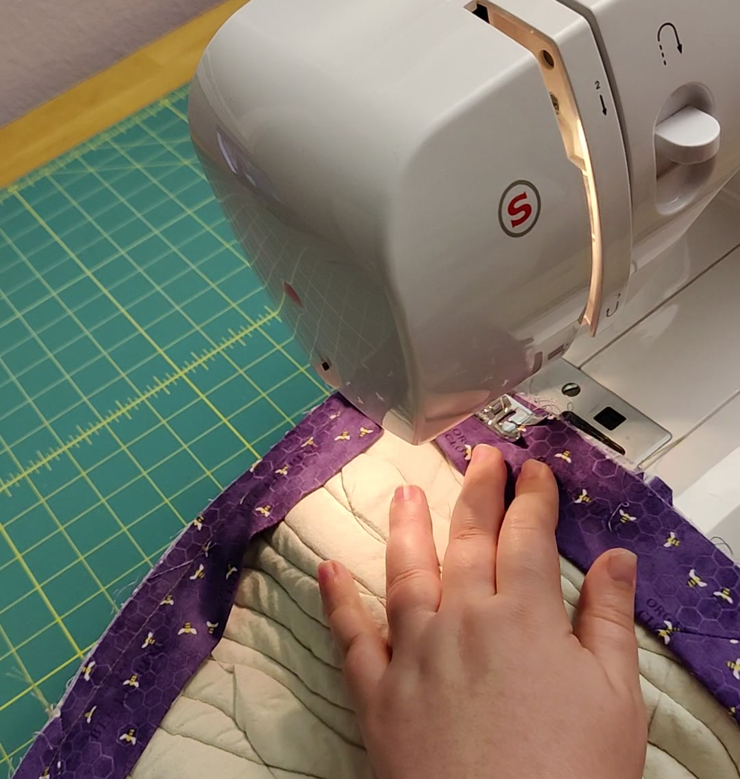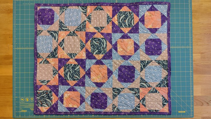 According to an article I found, the continuous strip binding method is durable and can be done entirely on the machine, sold! I cut up the extra purple fabric and assembled it into a binding strip. I sewed the strip to the back of the quilt, leaving room to create mitered corners. Then more pressing to get the binding to fold over to the front of the quilt nicely. And I finished the binding with an angled double cross stitch (I had to look up the stitch name in Singer’s stitch reference). I stitched down the middle of the binding which looks fine, but in future quilts I will try stitching over the binding edge instead to make it lie a bit flatter.