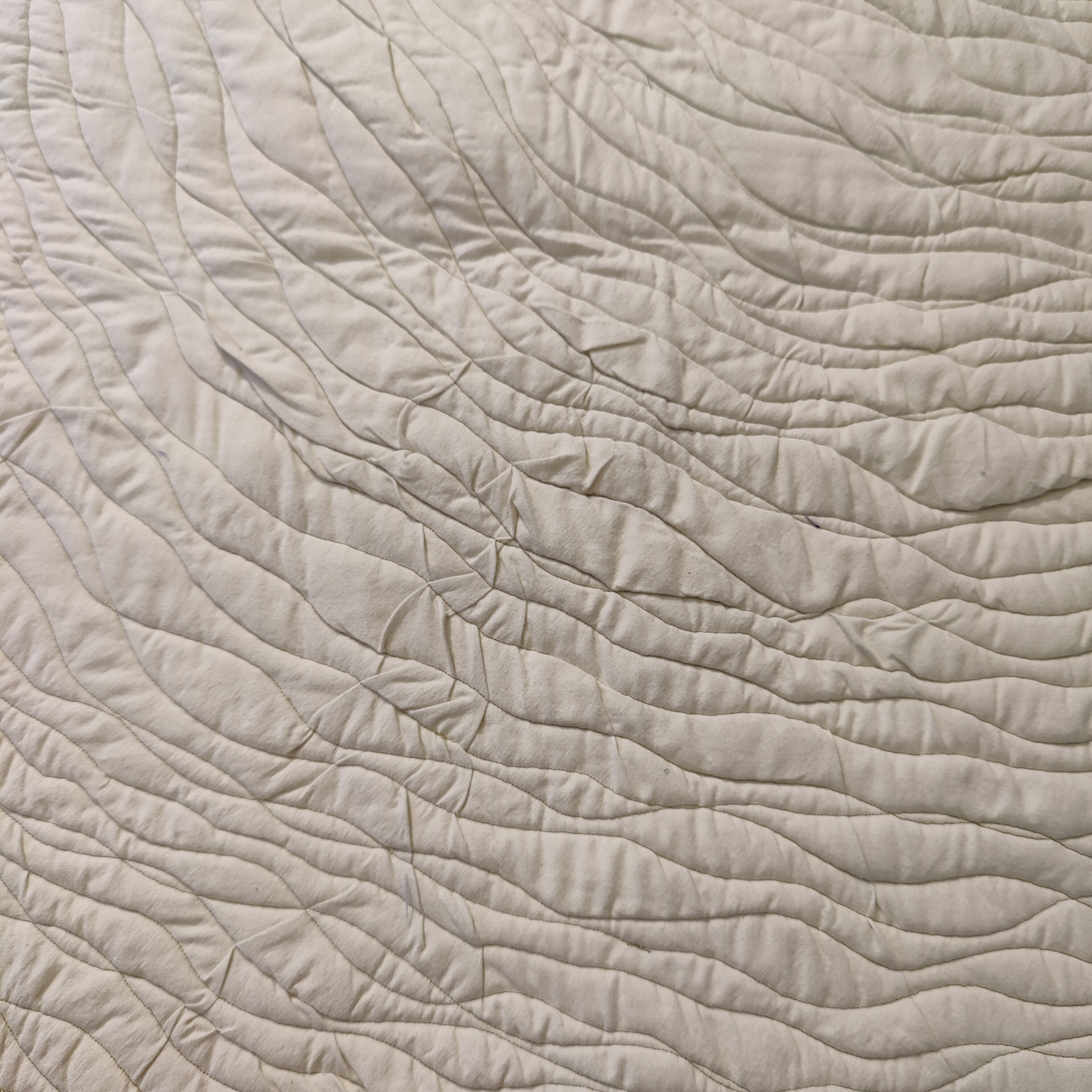 It turns out that quilting is my favorite part of this whole process. There is something about sewing random lines over a carefully constructed fabric pattern that is just so satisfying… Anyway, for this quilt I decided to go with an organic wavy quilting pattern to contrast with the geometric fabric layout. I cut my backing and batting to size and basted the whole thing together, forming my sandwich. From there, I started in one corner and worked my way diagonally across the piece. For a first attempt at quilting it when pretty well, but there are definitely areas to improve: