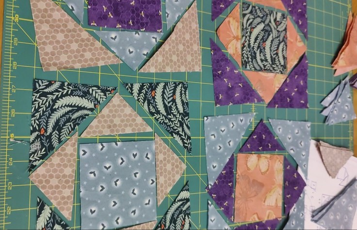 Since I bought the same amount of each fabric (except the extra purple to use for a binding), I wanted to come up with a design that would use each color evenly. I decided on a pattern of squares and triangles that would let me rotate through the colors. Since there were five total colors, I cut enough pieces to create twenty squares (twenty because it is divisible by five). The cutting was pretty easy because each triangle was just a half or quarter of the larger square shape.