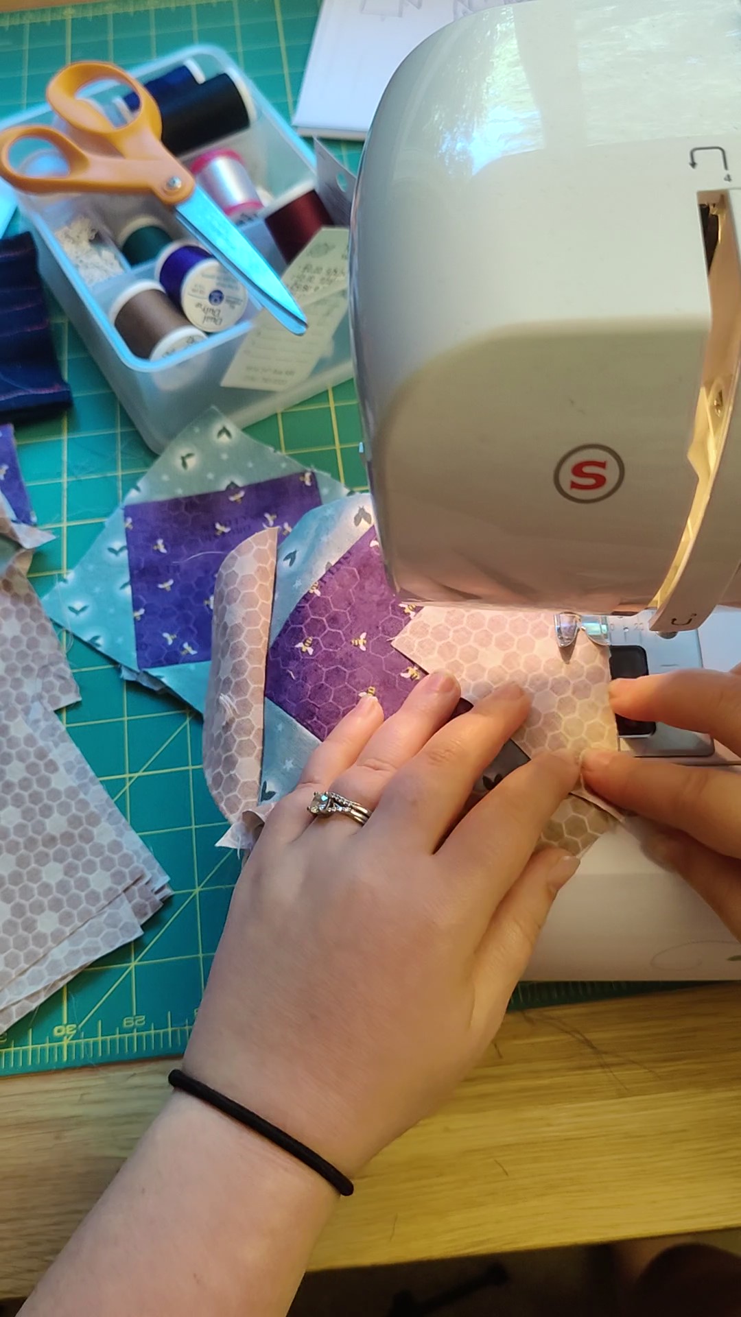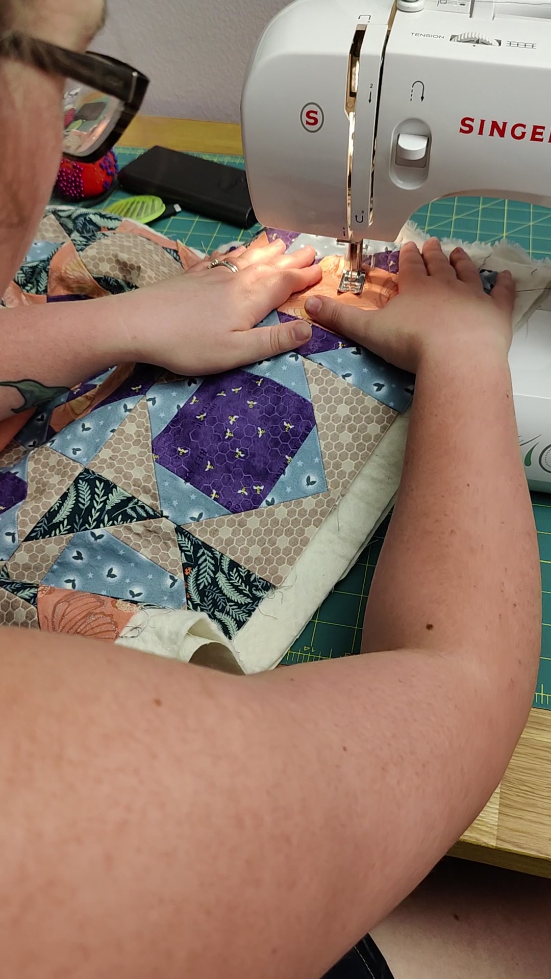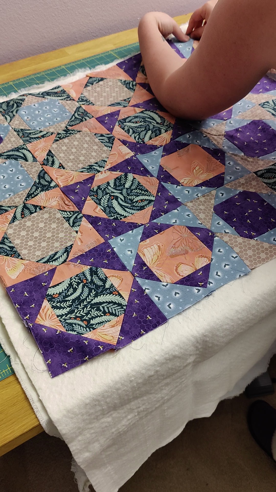 • Everything is easier if it’s flat – I was sewing on a table top which made moving the fabric up and over the sewing machine. I have since gotten a table with a drop down for my machine. I think it will make the quilting process much smoother.